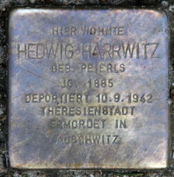 Hedwig Peierls, aus Breslauer jüdischer Familie, heiratete 1938 den Berliner Verleger und Antiquar Max Harrwitz. Eintrag im Gedenkbuch/Bundesarchiv: Harrwitz, Hedwig geb. Peierls * 10. Oktober 1885 in Breslau wohnhaft in Berlin Deportation: ab Berlin 10. September 1942, Theresienstadt, Ghetto 16. Mai 1944, Auschwitz, Vernichtungslager